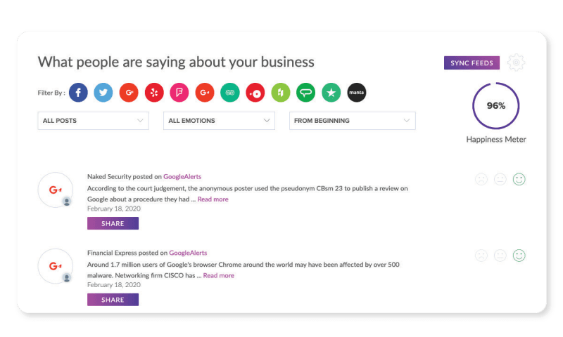 A business brand is only as strong as what people are saying about it. With Reputation Manager your clients can monitor what people are saying about their brand, and respond across multiple platforms. Sentiment analysis provides easy to track and useful data. The best way to improve your reputation is to manage it!